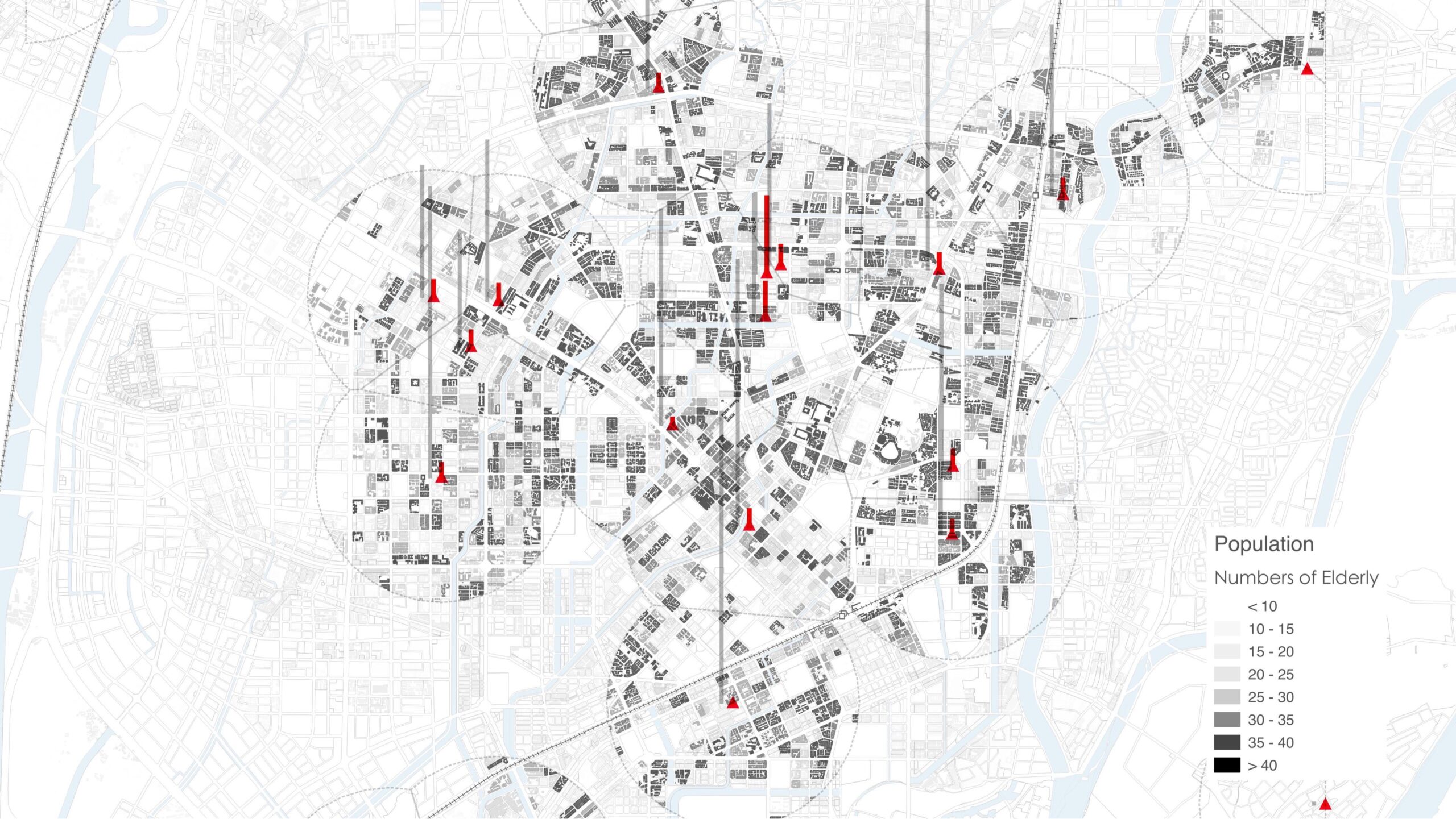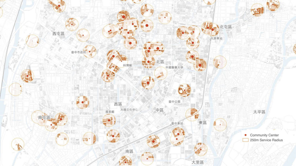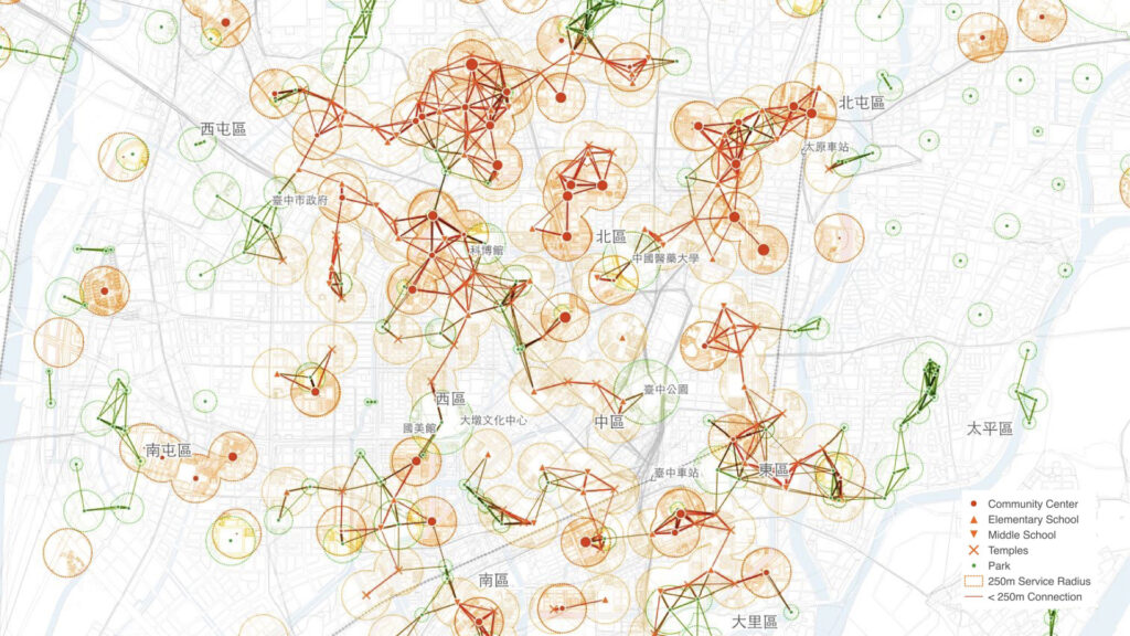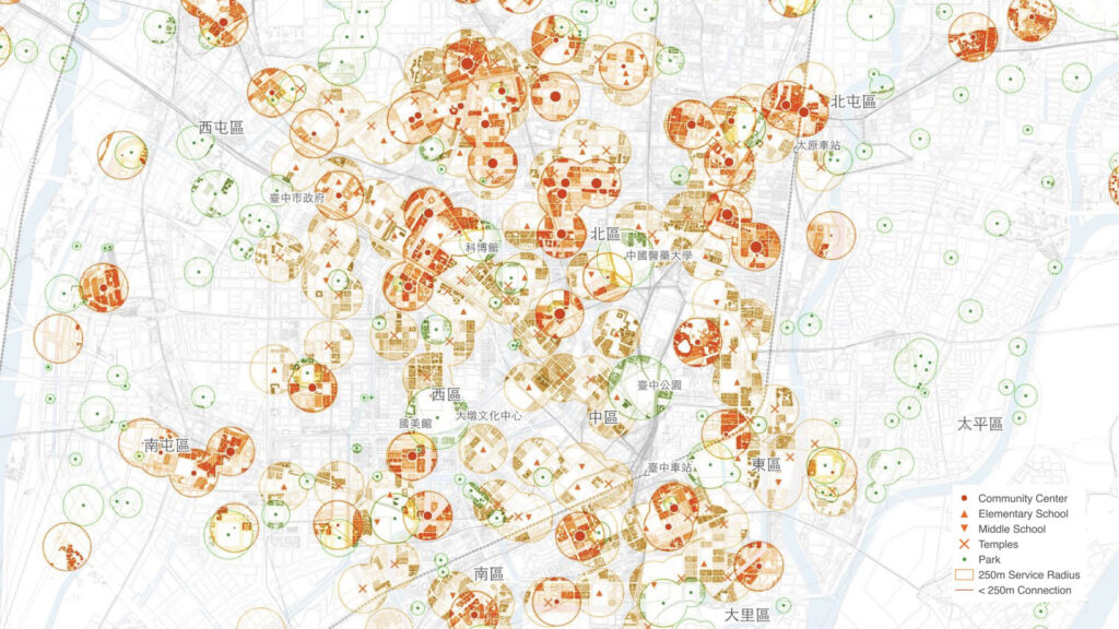 We developed a multi-dimensional mapping framework, overlaying housing prices and population density with five categories of functional POIs and dynamic MoBike cycling trajectories. The resulting cartography visualizes the neighborhood’s vibrancy core, where high-density service grids overlap with seamless micro-mobility. This diagnostic tool provides direct visual evidence for identifying “vitality gaps” and informing precise streetscape interventions.